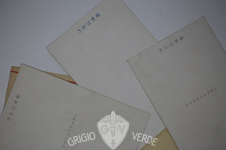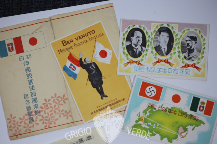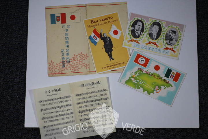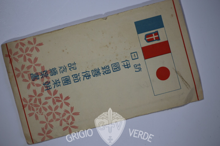 spettacolare e raro insieme di cartoline ricordo , stampate in Giappone e regalate ai partecipanti della missione italiana fascista in Giappone. Il libretto si apre alla maniera giapponese e quindi da sinistra a destra  , al contario della maniera occidentale. All’intenro anche un volantino in carta di riso con la versione della marcia reale e di Giovinezza , in Tedesco , italiano e giapponese.