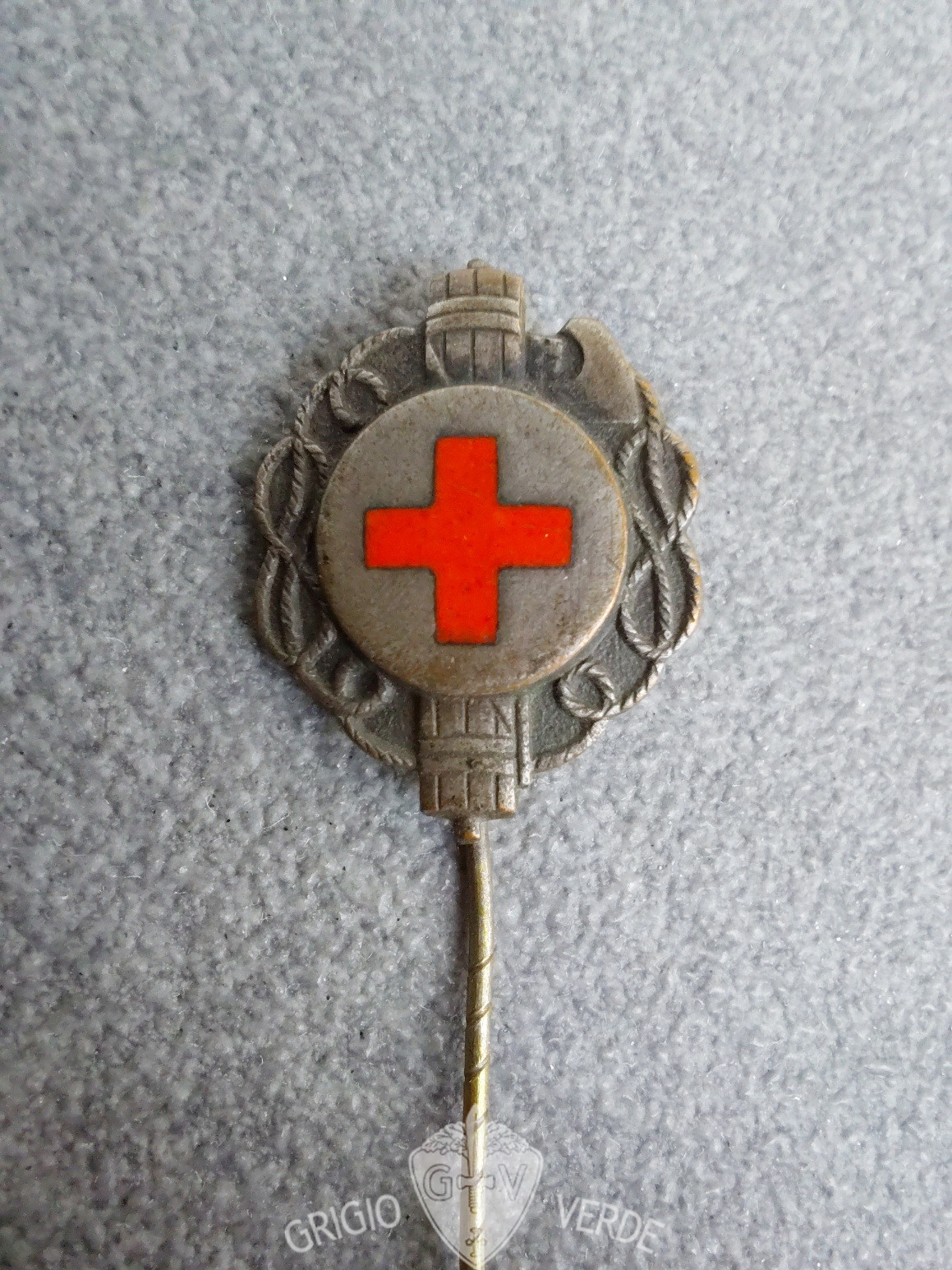 CRI Croce Rossa Italiana distintivo fascio littorio , in ottone argentato , smalto rosso perfetto