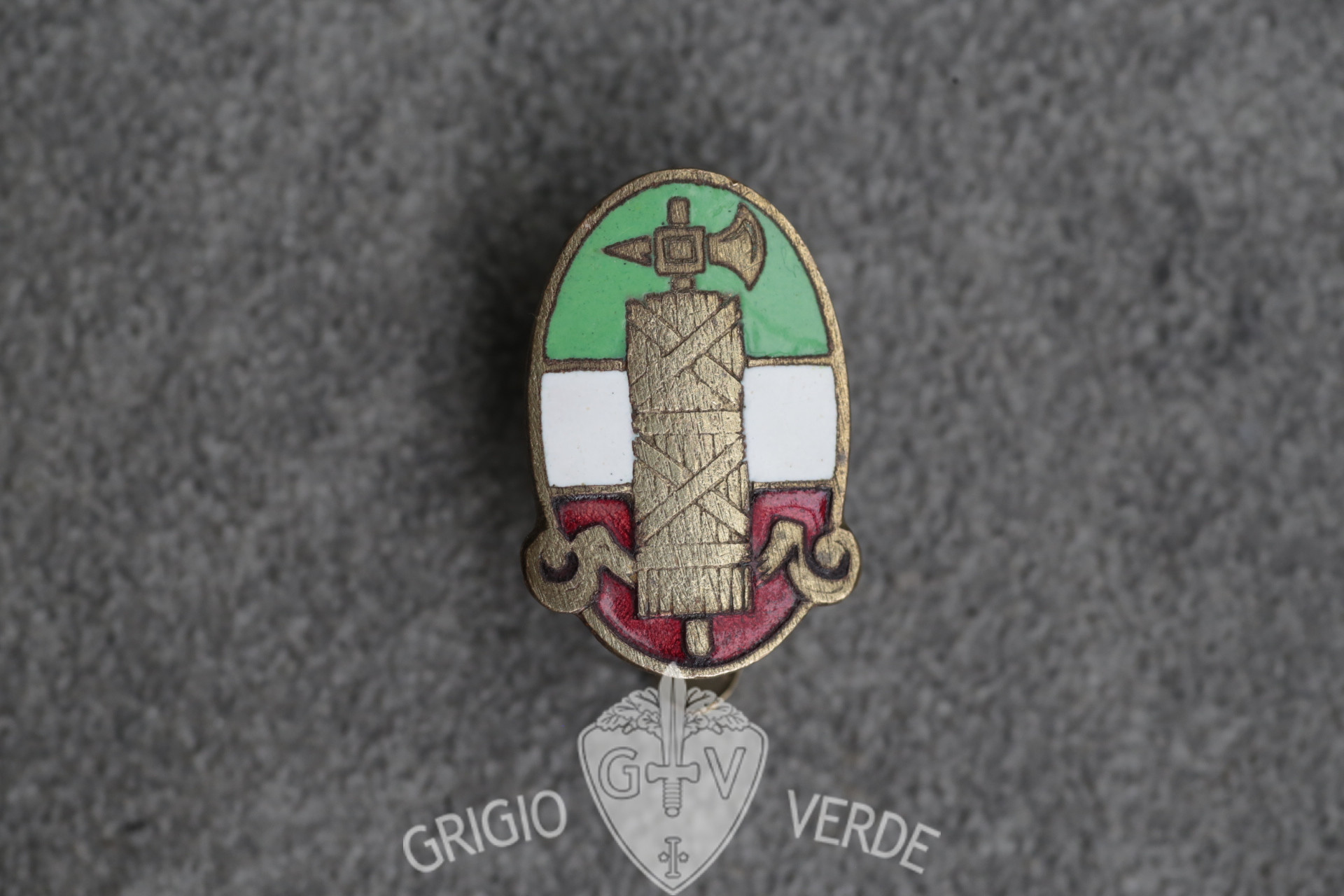 Distintivo fascista antemarcia, databile dal 1919 al 1922 . L’assenza delle lettere PNF (partito nazionale fascista) lo colloca nel lasso di tempo che va dalla creazione dei fasci di combattimento alla Marcia su Roma.