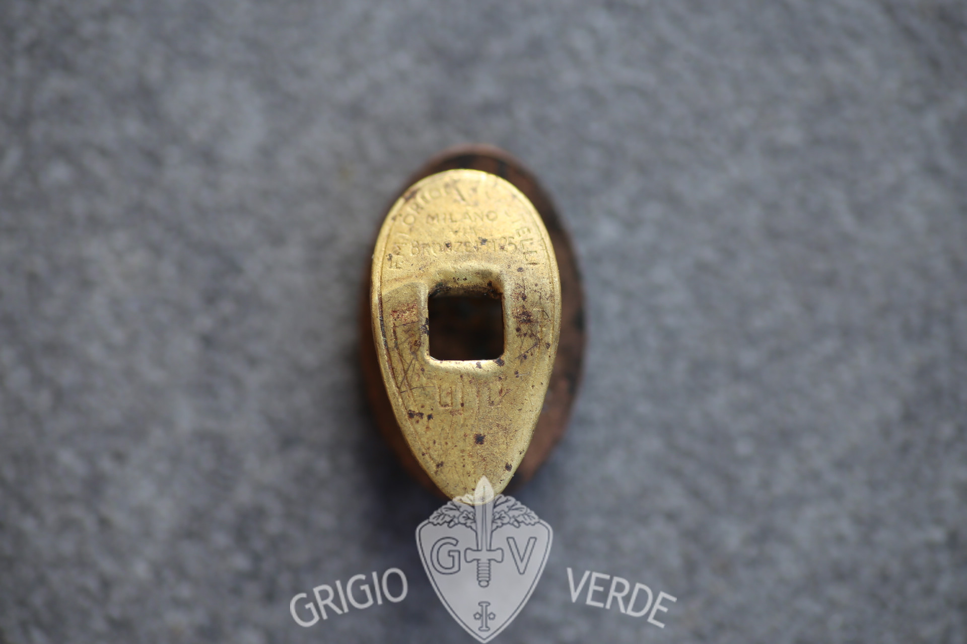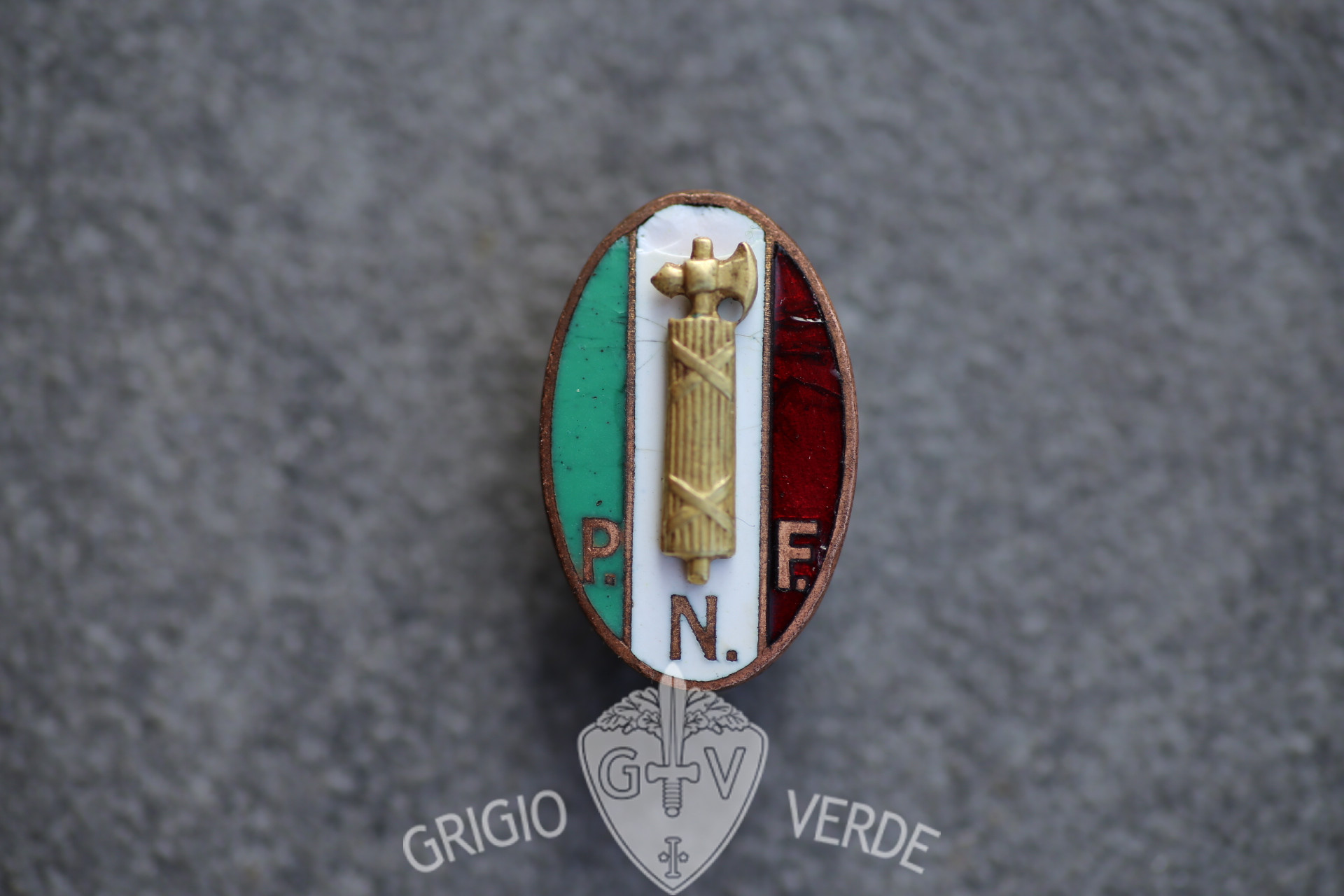 Distintivo fascista della prima ora , databile dal 1922 al 1927 . La presenza delle lettere P. N. F. -Partito Nazionale Fascista- e del fascio littorio repubblicano ( scure sommitale) lo colloca nel lasso di tempo che va dal 1922 Marcia su Roma , al cambio dell’iconografia del fascio littorio avvenuta nel 1927-28