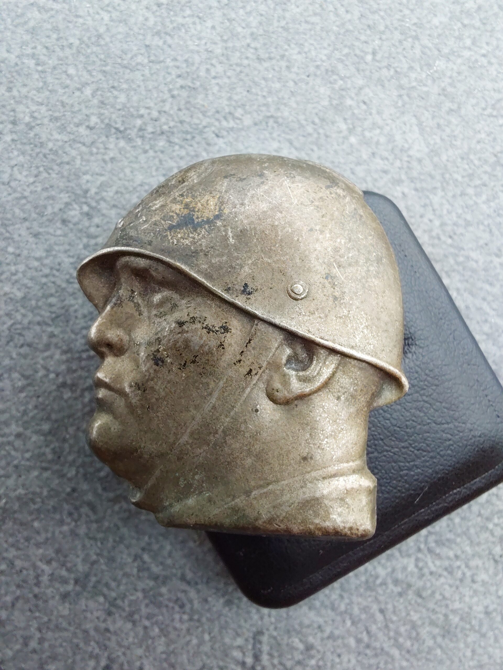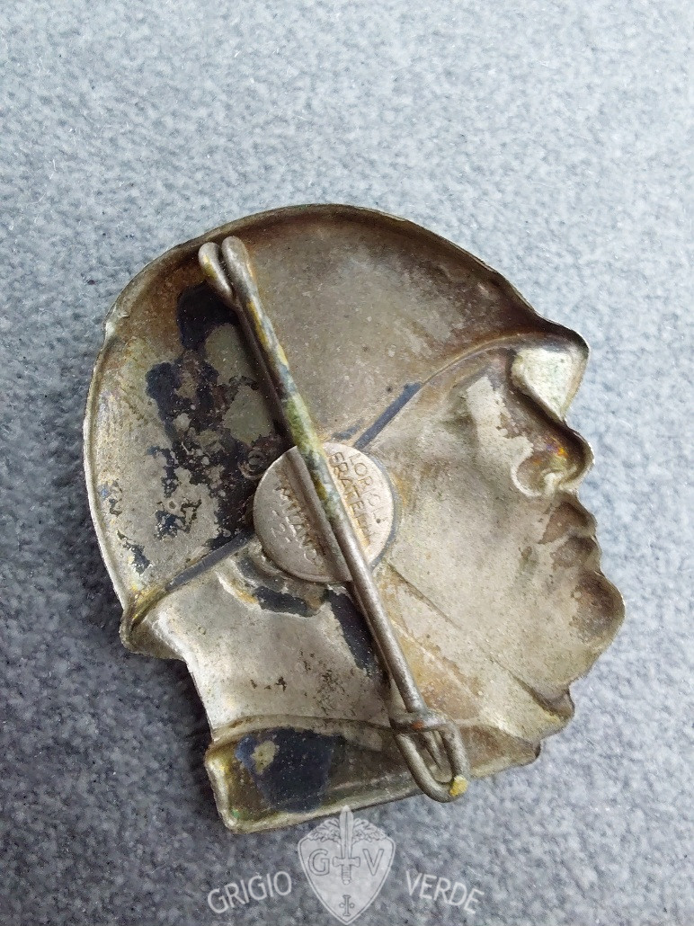 distintivo di propaganda “Ducesca” , il Duce , S.E. Benito Mussolini é rappresentato con elmo sulla testa . il duce combattente .