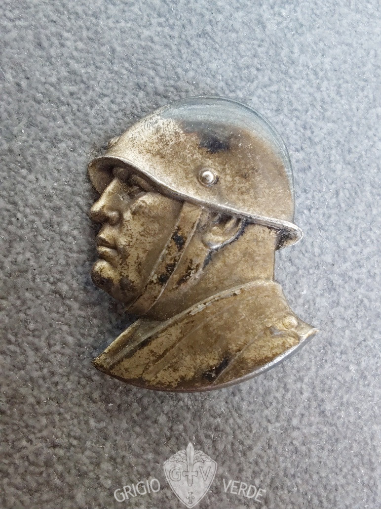 distintivo di propaganda “Ducesca” , il Duce , S.E. Benito Mussolini é rappresentato con elmo sulla testa . il duce combattente .