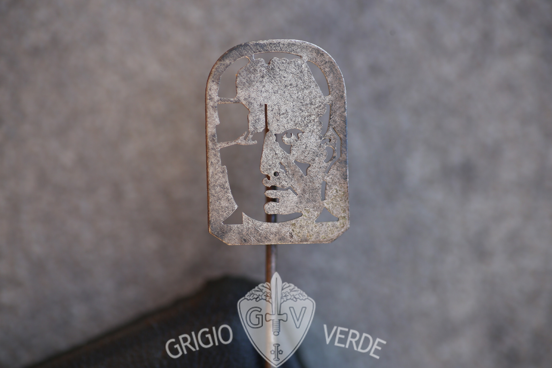Raro distintivo traforato di propaganda raffigurante il Duce del Fascismo. Ispirato ad un Ritratto noto dei primissimi anni ’20 , dei primordi dello squadrismo.