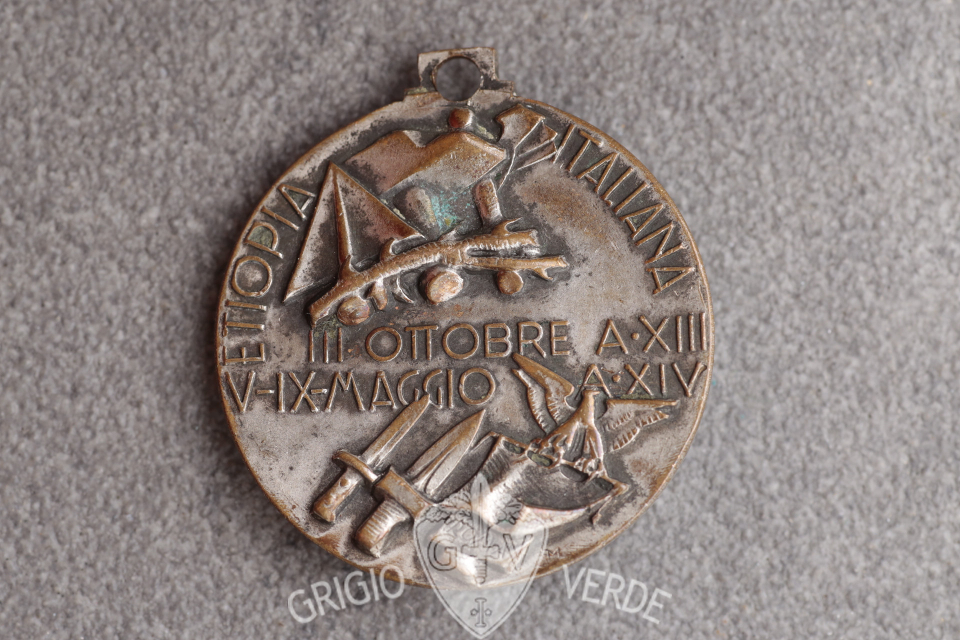 Medaglia in bronzo argentato della campagna di guerra in africa orientale italiana 1936. Al dritto della medaglia: teste accollate della Vittoria e di soldato a sinistra, fascio e stella. Sul retro: “ETIOPIA ITALIANA” sopra arnesi di lavoro, sotto “III OTTOBRE A. XIII IX MAGGIO A. XIV”, pugnali ed aquila su labaro, sotto scritta ROMA.