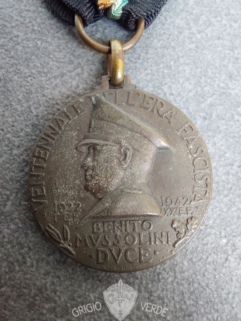 Medaglia, portativa con appiccagnolo a staffa ed anello, emessa per propaganda il ventennale dell’era fascista. Al dritto busto a s. con uniforme e cappello di Benito Mussolini intorno scritta VENTENNALE DELL’ERA FASCISTA ai lati 1922 I E.F. 1942 XX E.F. sotto BENITO MVSSOLINI DVCE, tra rametto di alloro e quercia, in basso P. MORBIDVCCI. Al rovescio angelo con spada spezza falce e martello, a d. fascio verticale con lama a d., OGGI NON CI SAREBBE LA MARCIA SV MOSCA SE VENTI ANNI PRIMA NON CI FOSSE STATA LA MARCIA SV ROMA M. a s. presso il bordo LORIOLI. Realizzata in Zama bronzata, Variante non comune.