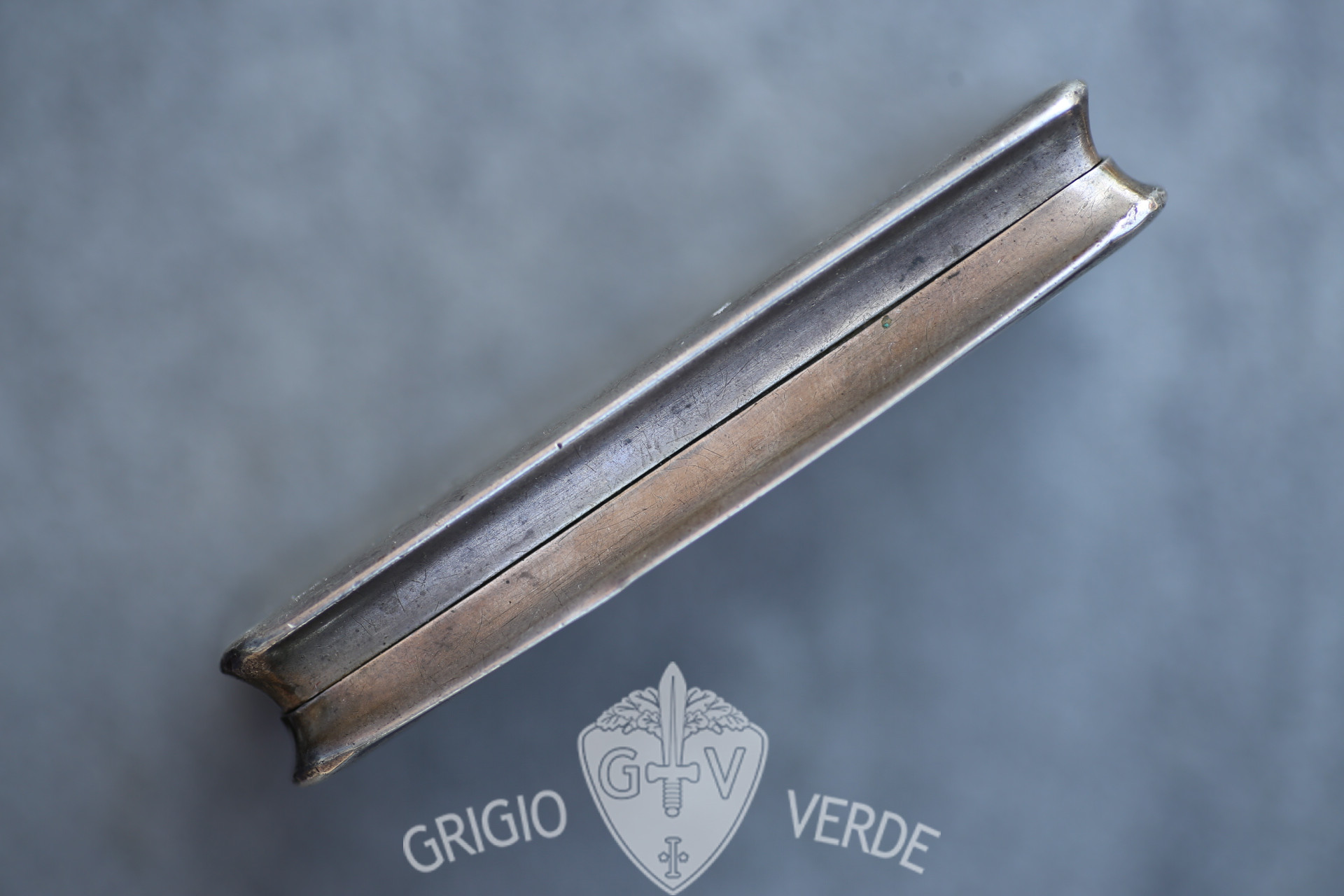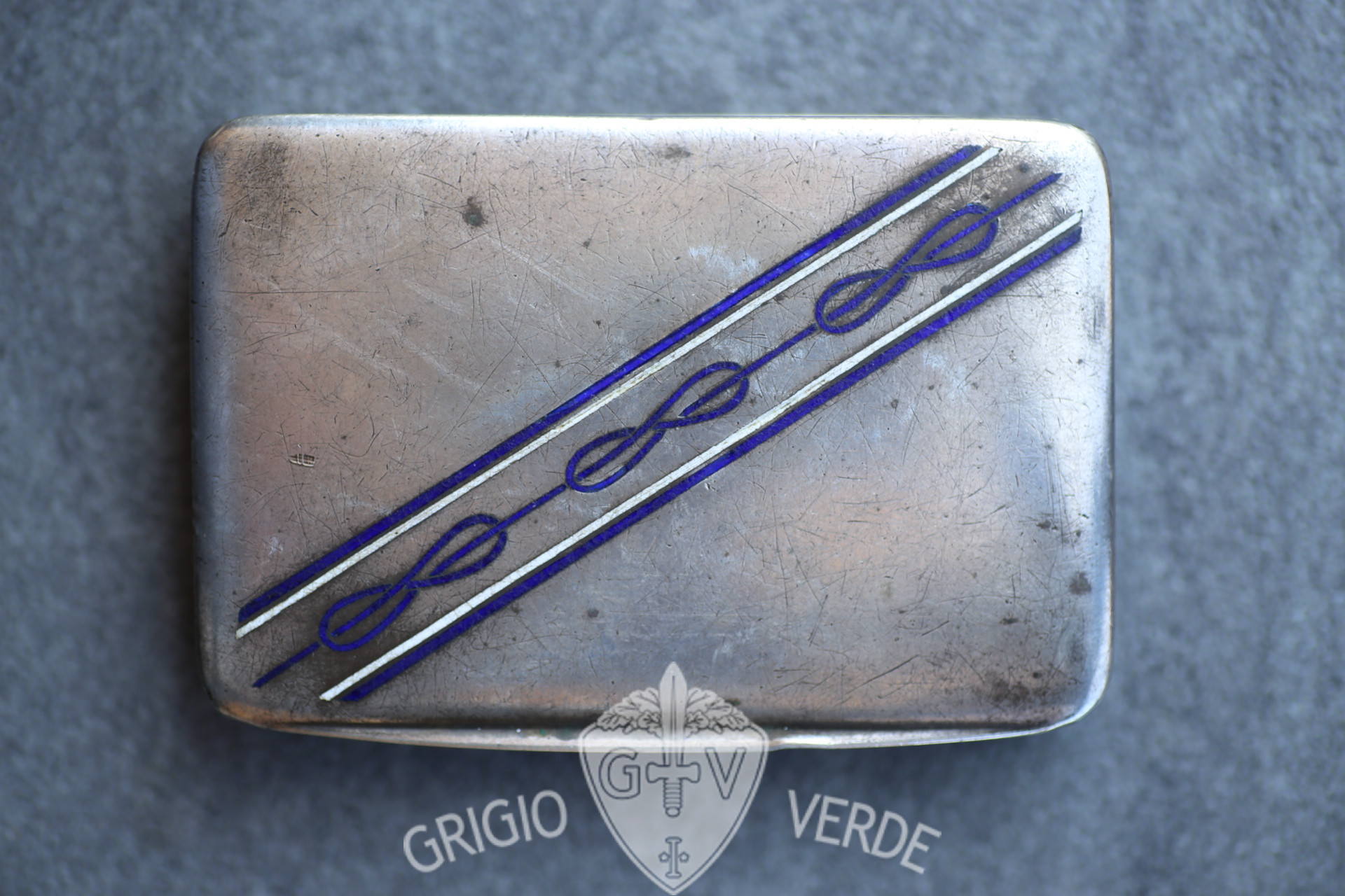 Interessante e rara scatolina porta tabacco con smalti azzurri e bianchi a motivo nodi Savoia , appartenuta ad un Fascista Nazionalista di Parma.