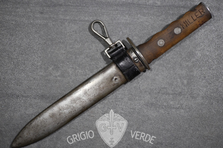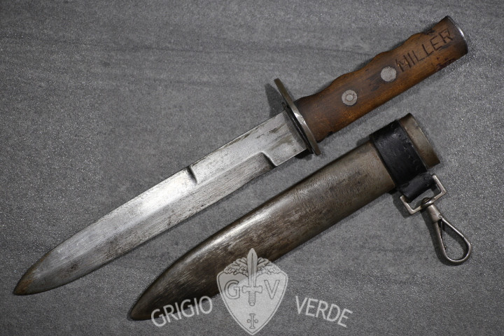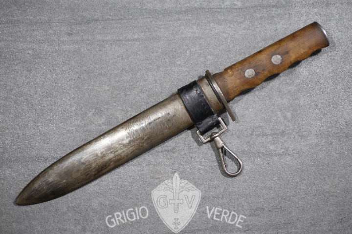 bel pugnale da marcia della milizia volontaria sicurezza nazionale M.V.S.N. , modello 1935 , usato in colonia in Africa orientale italiana e non solo dalle camicie nere. Il fascio littorio sul fodero é stato abraso e la guardia modificata . Probabile utilizzo in epoca R.S.I.