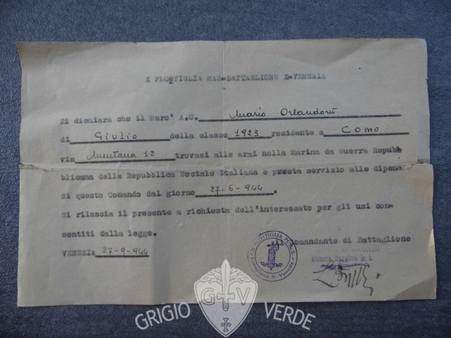 Dichiarazione del x° battaglione Venezia della X° flottiglia M.A.S. del 1944 per un Marò in armi presso questo reparto.