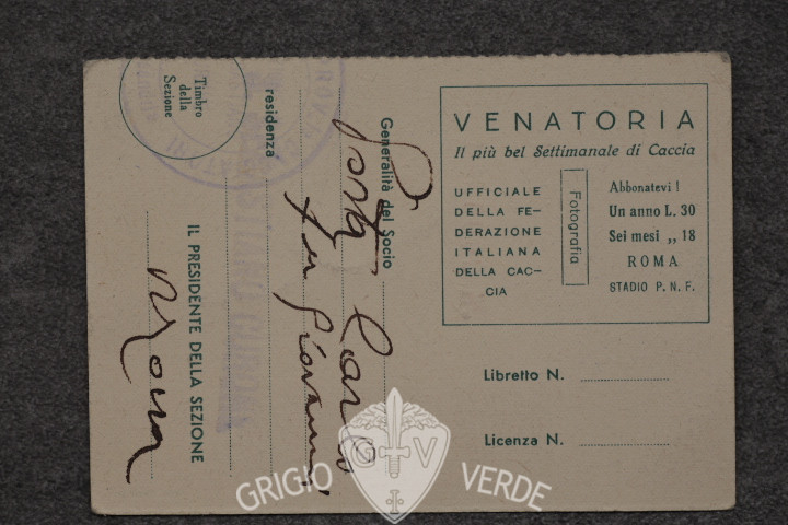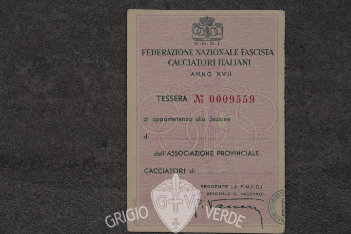 Tessera Federazione nazionale fascista cacciatori italiani 1939